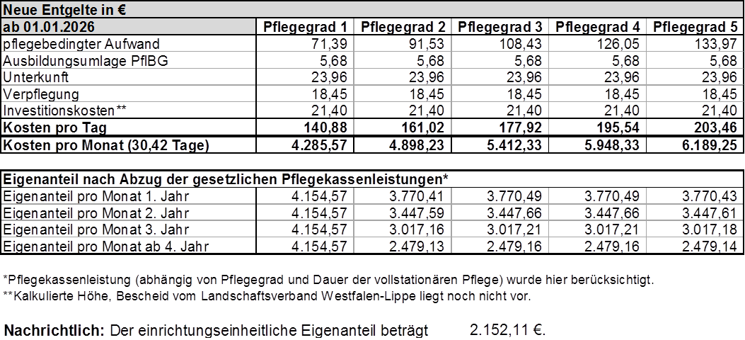 Alle oben genannten Pflegesätze werden regelmäßig neu mit dem Landschaftsverband Westfalen-Lippe und der Arbeitsgemeinschaft der Pflegekassen in NRW vereinbart. Daher können wir für die Aktualität der jeweils genannten Beträge keine Gewähr geben. Druckfehler und Irrtümer sind vorbehalten.