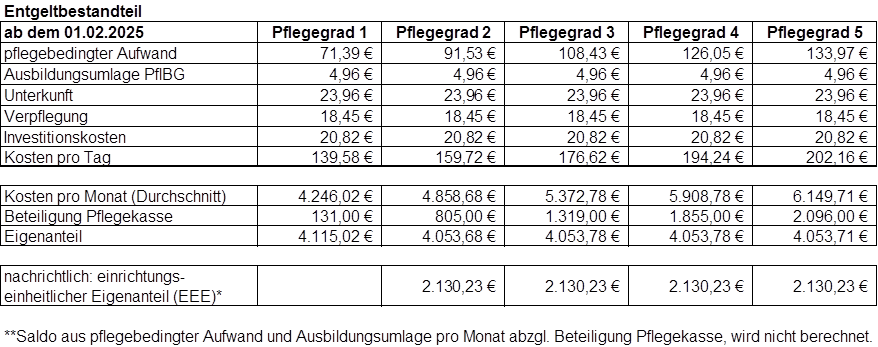 Alle oben genannten Pflegesätze werden regelmäßig neu mit dem Landschaftsverband Westfalen-Lippe und der Arbeitsgemeinschaft der Pflegekassen in NRW vereinbart. Daher können wir für die Aktualität der jeweils genannten Beträge keine Gewähr geben. Druckfehler und Irrtümer sind vorbehalten.
